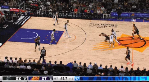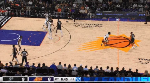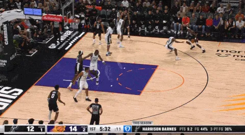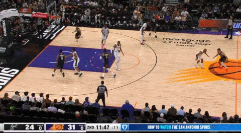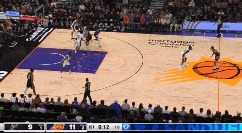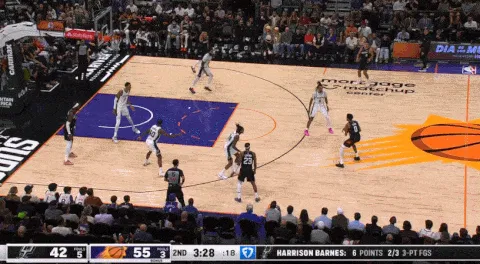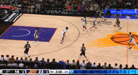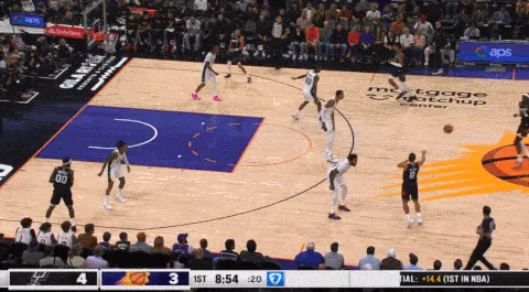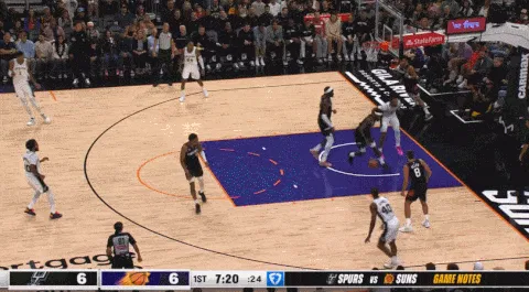 這次也是非常絕妙的二次處理制造單打空間的回合:布克第一次突破被馬刺身邊的球員截停,吉萊斯皮迅速給到空切的古德溫,后者回給布克立刻制造出一對一的機(jī)會。