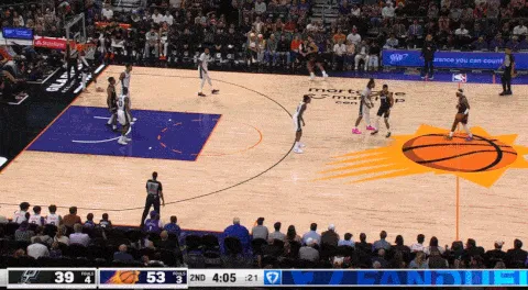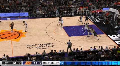 這種連續(xù)撕扯防線的意識也幫助他們破掉聯(lián)防,尤其是利用聯(lián)防形態(tài)下45°站位的空當(dāng),鄧恩第一次突破后回給布克,布克再次突分弧頂阿倫三分命中。