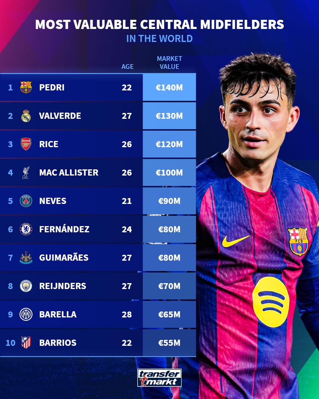 虎撲11月02日訊 德國轉(zhuǎn)會市場統(tǒng)計了當今足壇中前衛(wèi)球員的身價,排名前十的排行佩德球員情況如下: